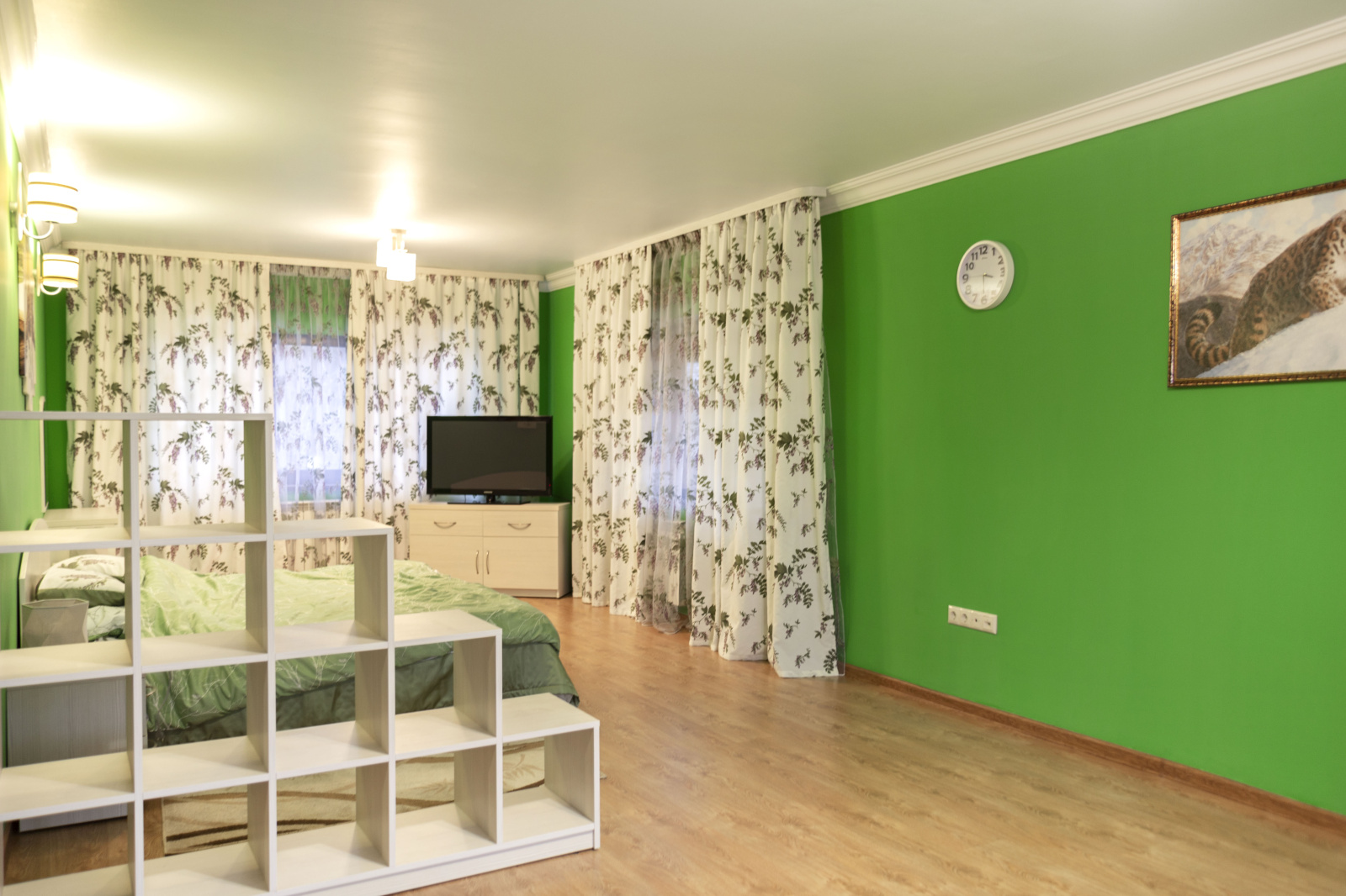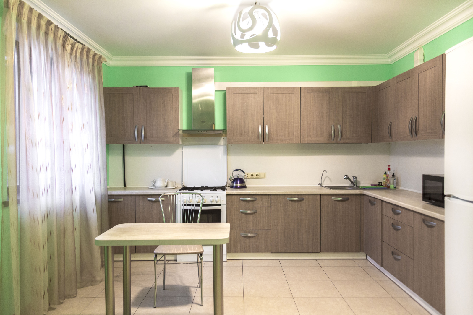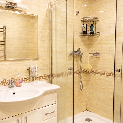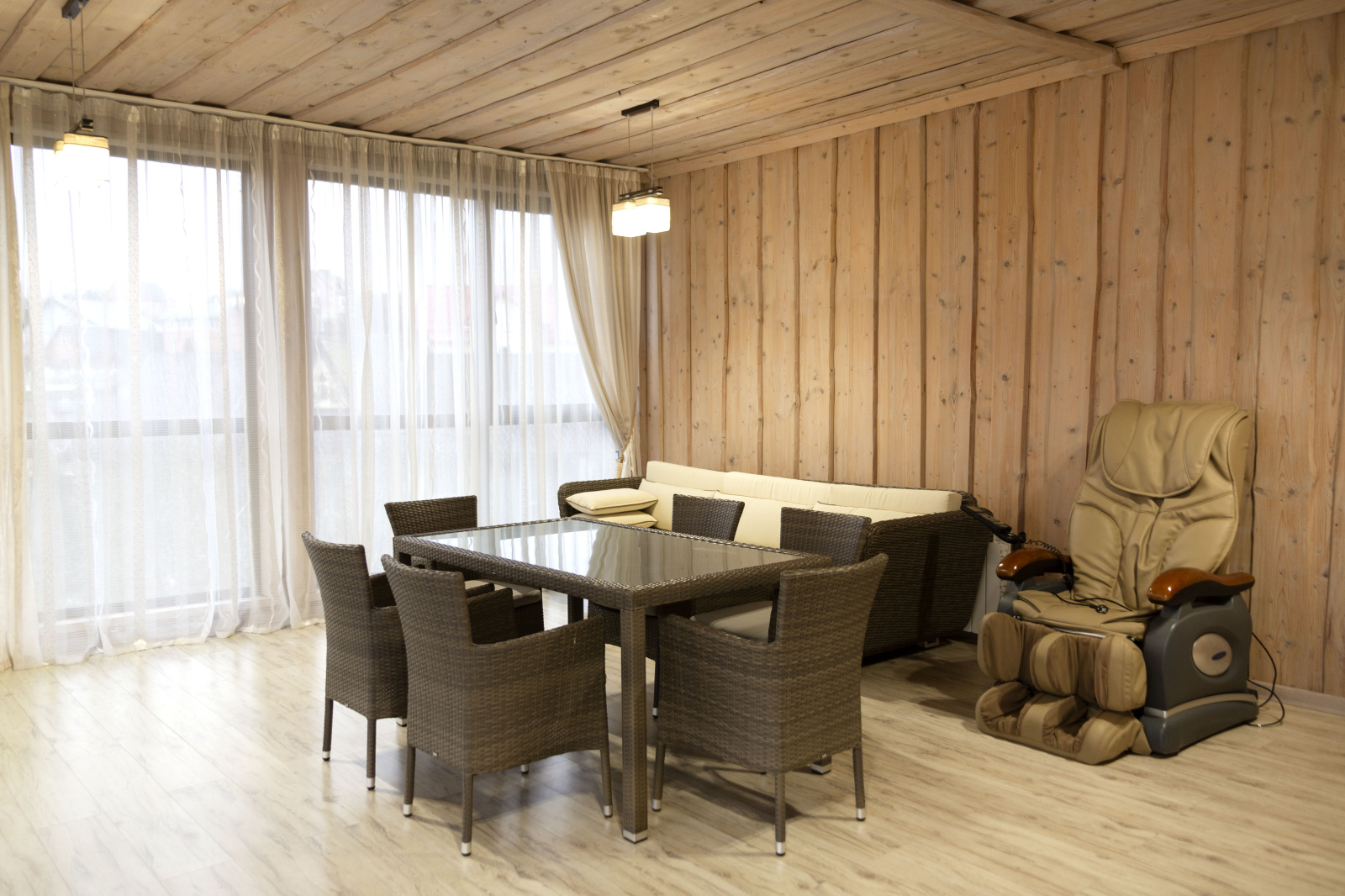 В распоряжении гостей 8 спальных комнат — от уединённых одноместных до семейных шестиместных. Интерьеры в светлых тонах, без излишнего декора, но с максимальным комфортом: уютные гостиные, полностью оборудованные кухни и ванные комнаты с душевыми кабинами.